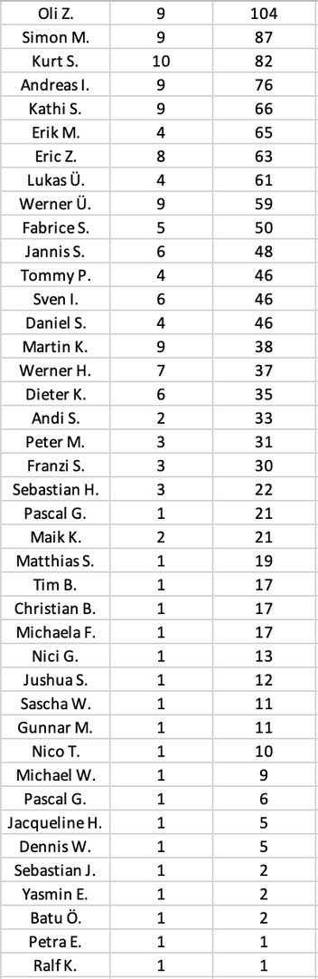 1) Für die Freitags-DYPs gibt es eine Jahresrangliste (siehe unten), die ersten werden am Jahresende entsprechend geehrt. U.a. gibt es einen Pokal zum Mitnehmen und eine Ehrentafel im Vereinsheim für den 1. Platz. Die Freitags-DYPs laufen genau so weiter wie bisher im Monster-DYP-Format mit 2,50 Startgeld und 100 Prozent Ausschüttung an die drei Erstplatzierten (50/30/20 Prozent).